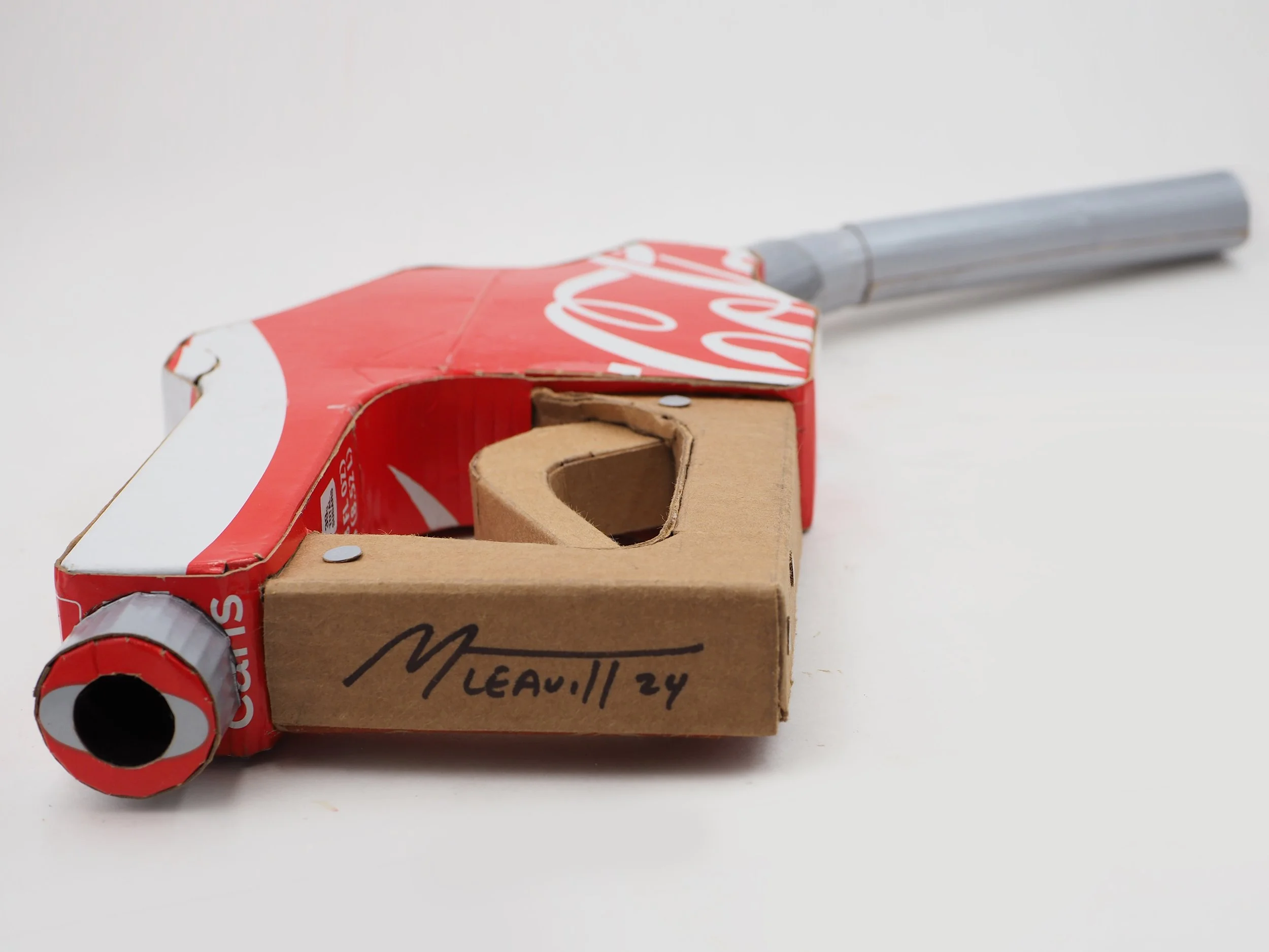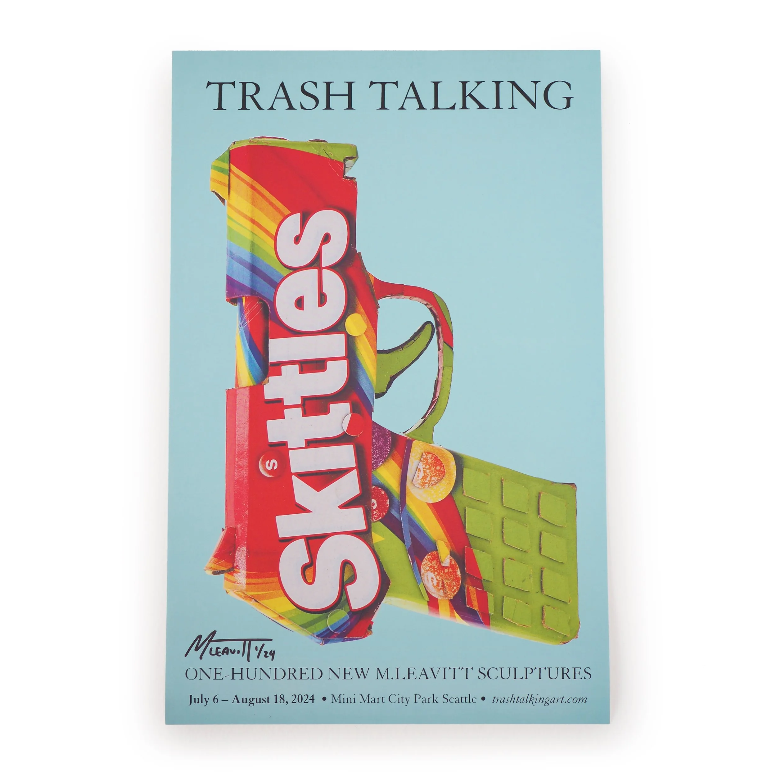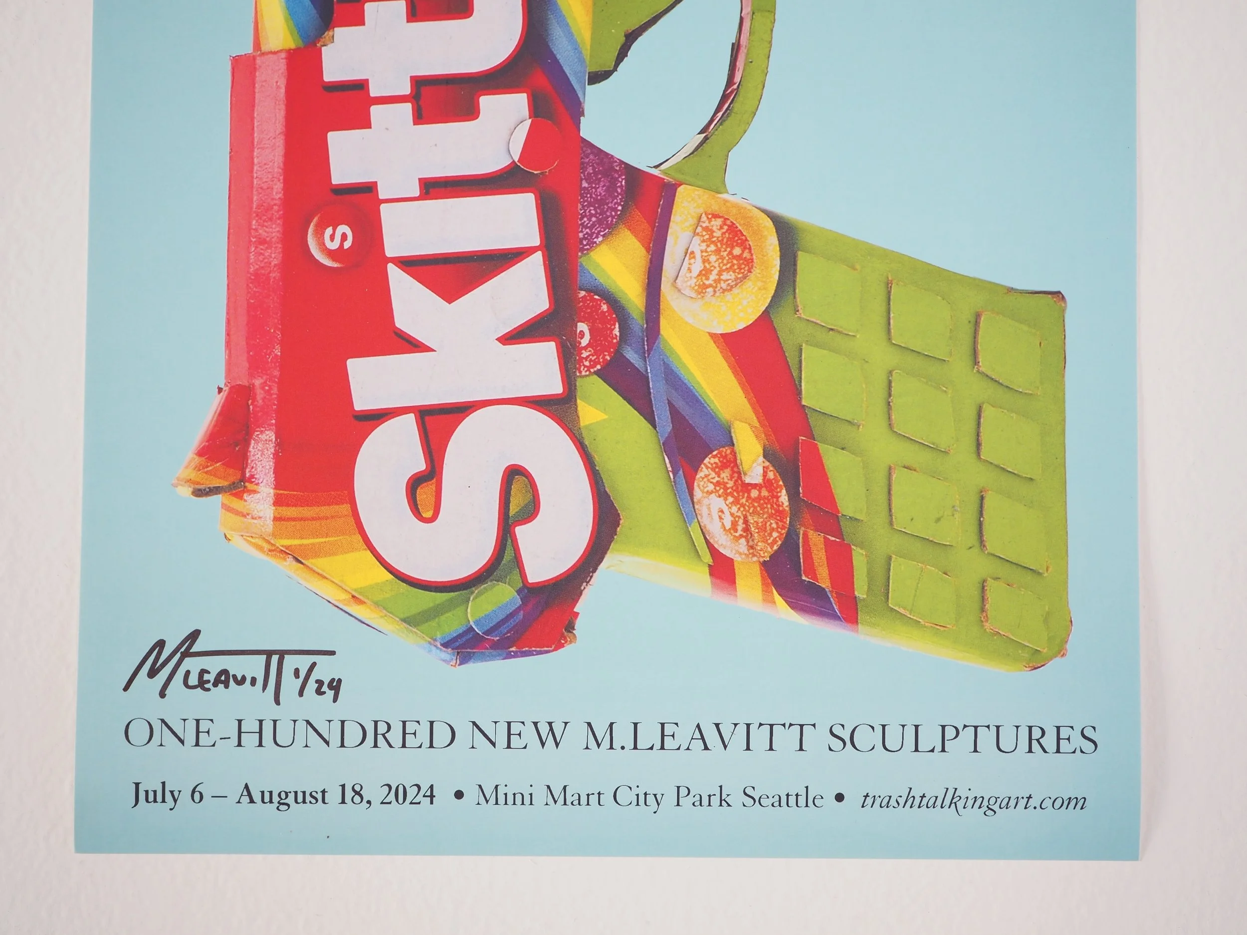 ‘Trash Talking’ is a series of more than 100 sculptures shining a light on toxicity and waste. Now with many pieces under wraps awaiting their next adventure, this series was designed for an old gas station mini mart. Each a life-size scale replica made with recycled cardboard and pallets salvaged from ‘real’ mini marts, every object and bit of reclaimed packaging was purposely chosen with a story. All graphics are native to the found material. No paint or ‘foreign’ matter was used to make the internal structures. Even when using his own templates, Leavitt builds each piece from scratch by himself in his garage with no assistance or outsourcing, and no AI.
